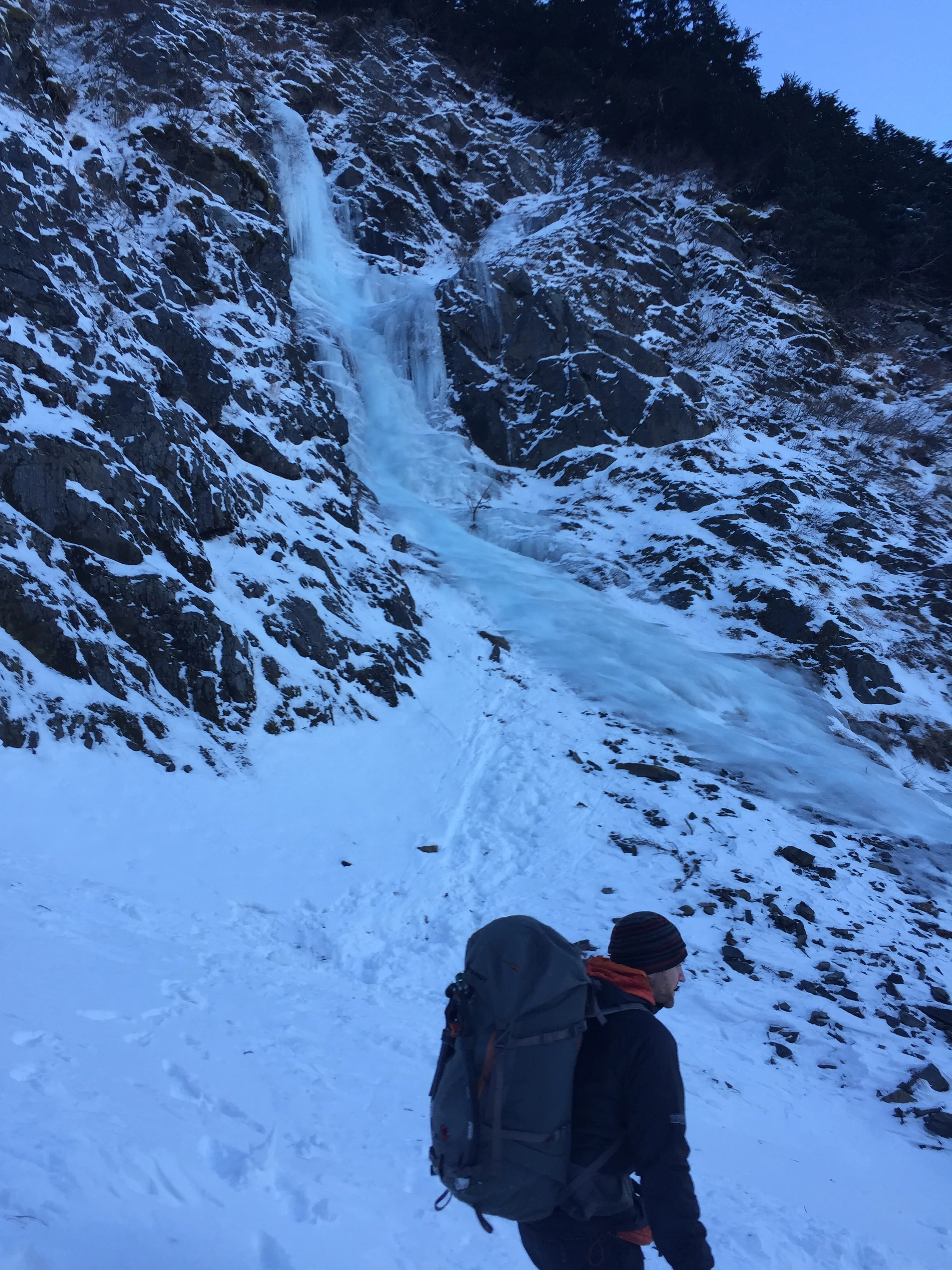 We went down to Portage this weekend. Saturday and Sunday had comfortable conditions and the ice is pretty fat. Ben and I did two trips down into the Portage Valley to try to get some classics in, many of them seem to be in good condition right now.