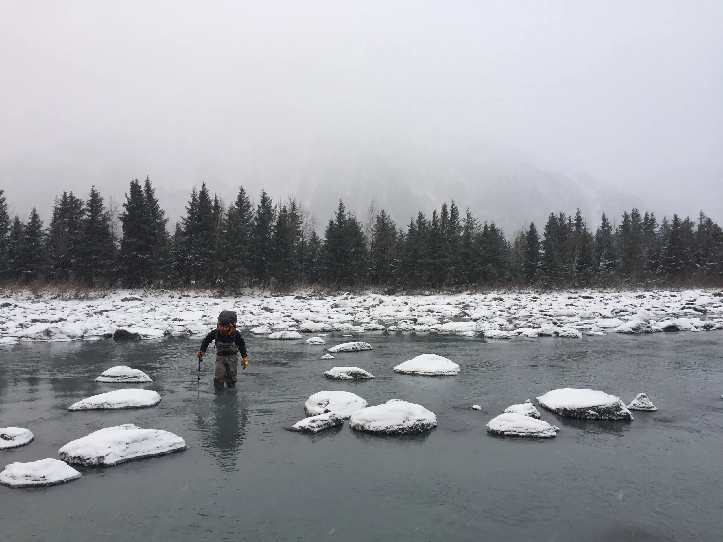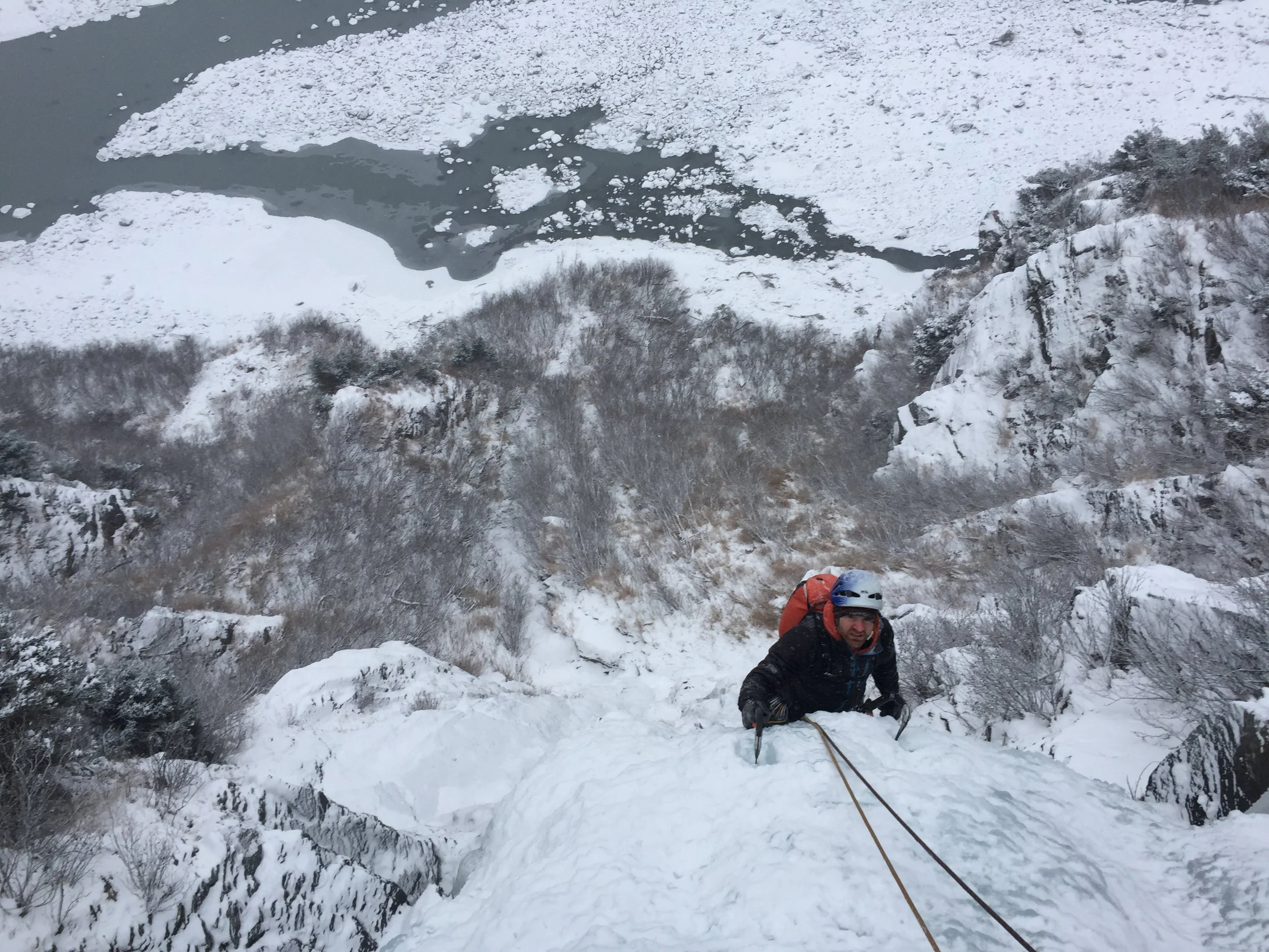The next morning involved doing hip waders to get across the Portage river to our destination: Follies. It's a classic WI4 that I had looked at since I have been in AK but for some reason had not climbed yet. 60m of nice sticky ice and an easy rap off, a fine time had by all. We drove back up to climb Flame Out in the sun, and finished our weekend.