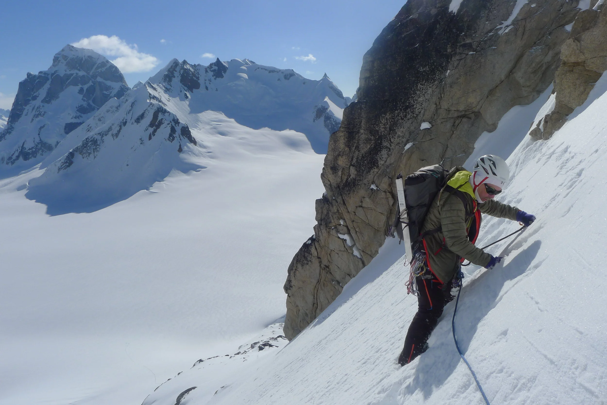Mark on 6858’s lower snowfield. The Citadel and Mystery Mountain behind.