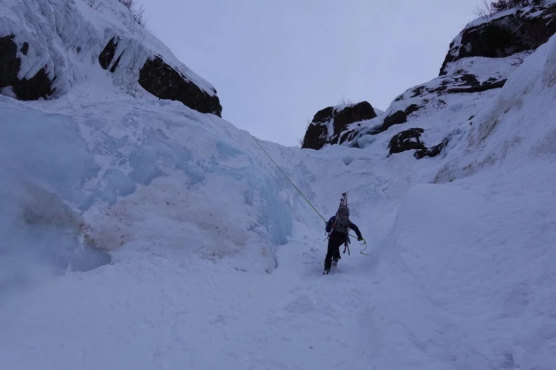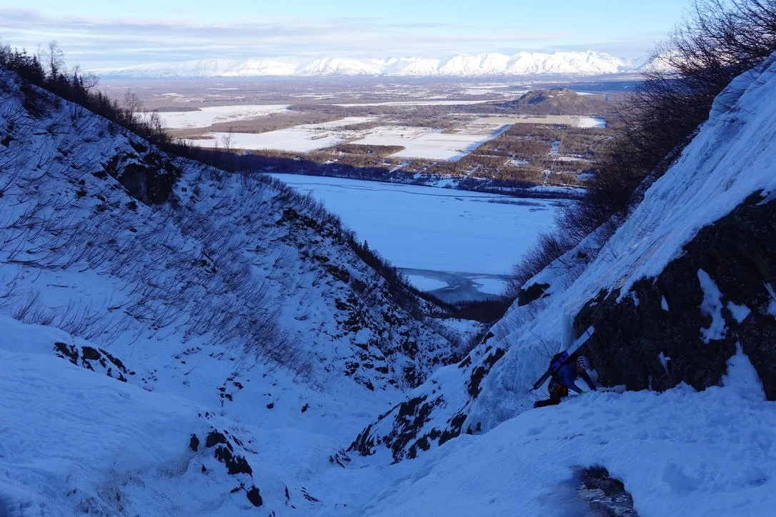 Skinning got us to the base of the first ice section. It’s a low angle ice gully in the alder, but it helps to have two tools to get past it. A bit more booting in the couloir and then out below the face where it was possible to put the skins on.