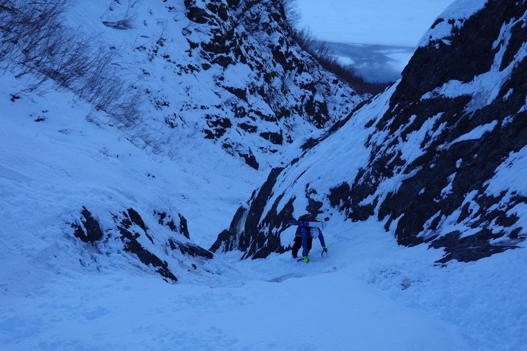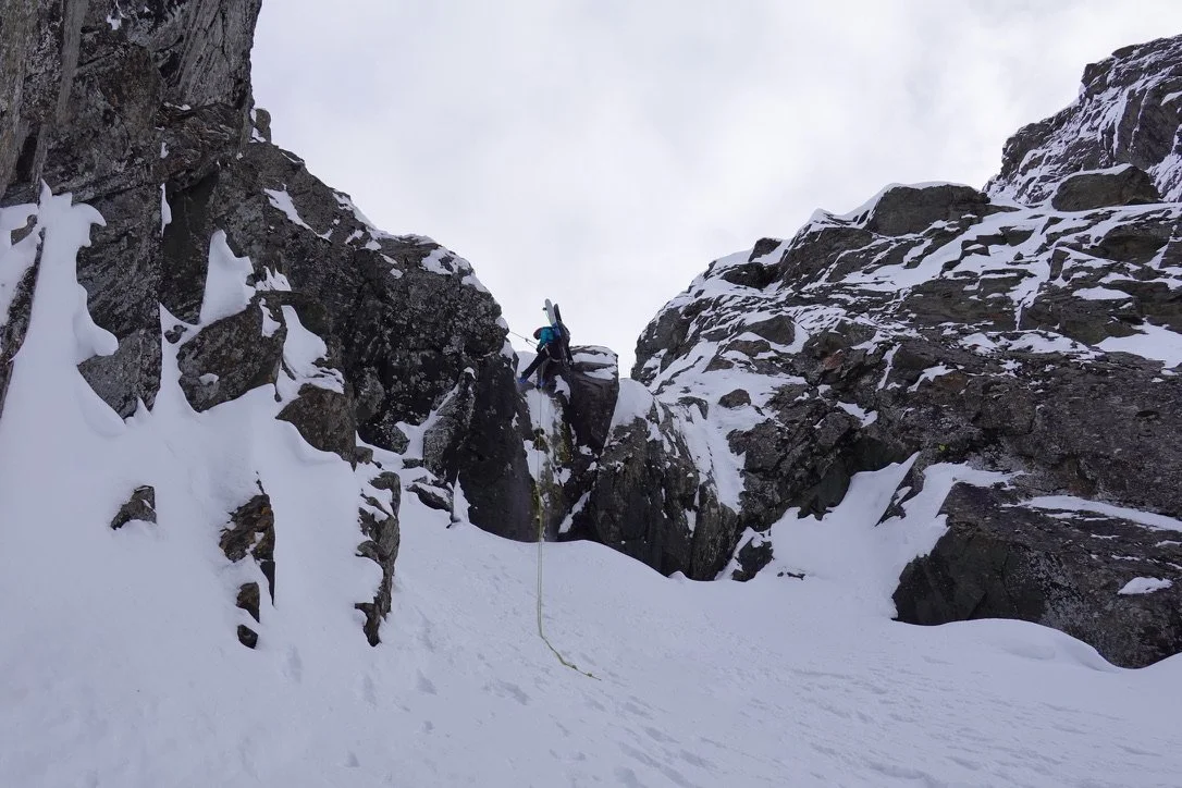 When we came back down to the ridge the other two skiers used our rope as a hand line for a bit as they went down, then we rigged up the Escaper and rapped down the first 40 meters of the line. Of course the first few turns are always the hardest. The light got flat as we put skis on at the base of the rap, which created interesting conditions for the steepest tightest part of the run. As we pitched it out on the descent the angle eased up a bit and the walls opened up to great skiing. We were still focused on the turns with the exposure below us, but the skiing was fun.