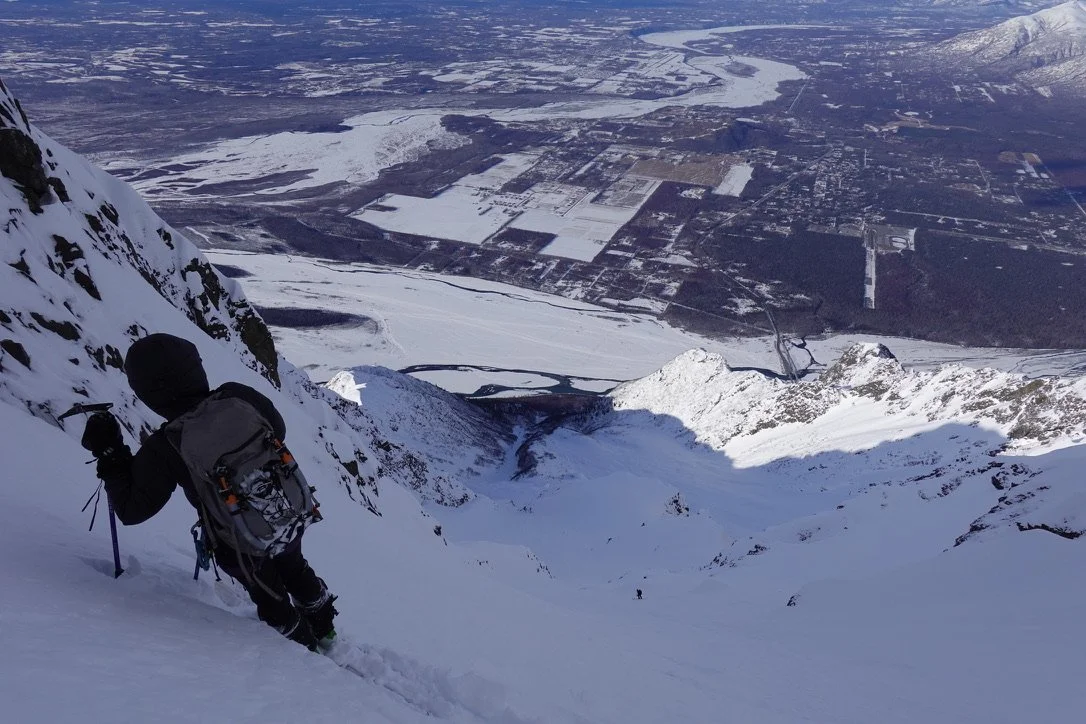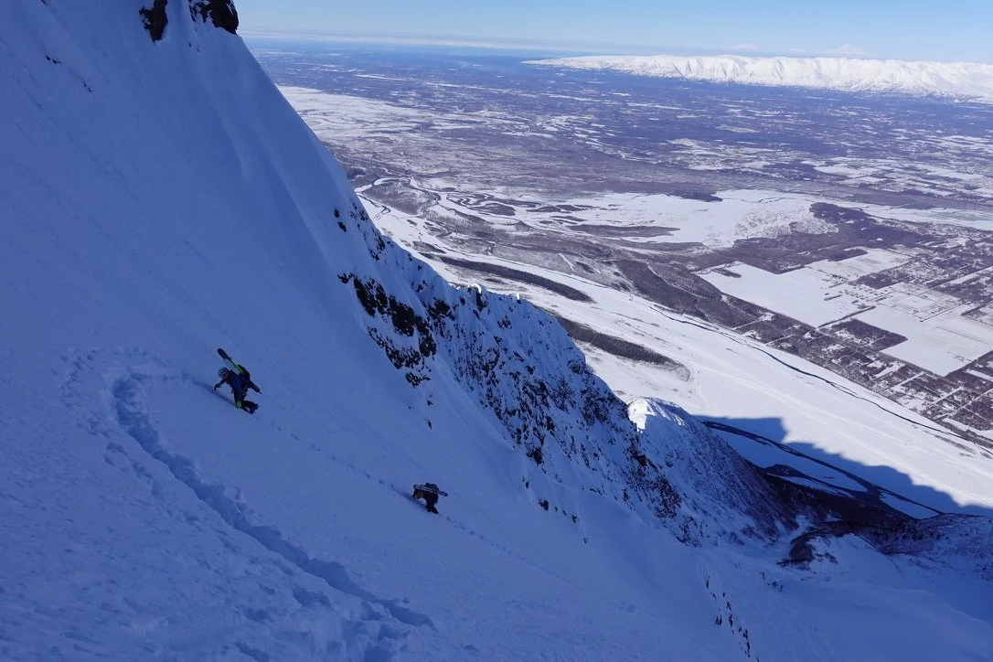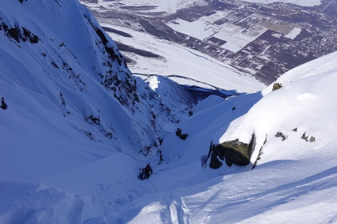The upper face has a few options lower down, but all eventually funnel into a steep upper couloir. Our line that started lookers right lead us up into this couloir, which deposited us on the top of the ridge leading up to the summit. The final 30 meters to the top of the ridge was steep and thin enough to feel comfortable using the rope. We left our skis at the ridge and walked the last 150’ to the top. I now regret not taking my skis up the last 150’ to ski the very top 150’, but I didn’t lose any sleep over it.