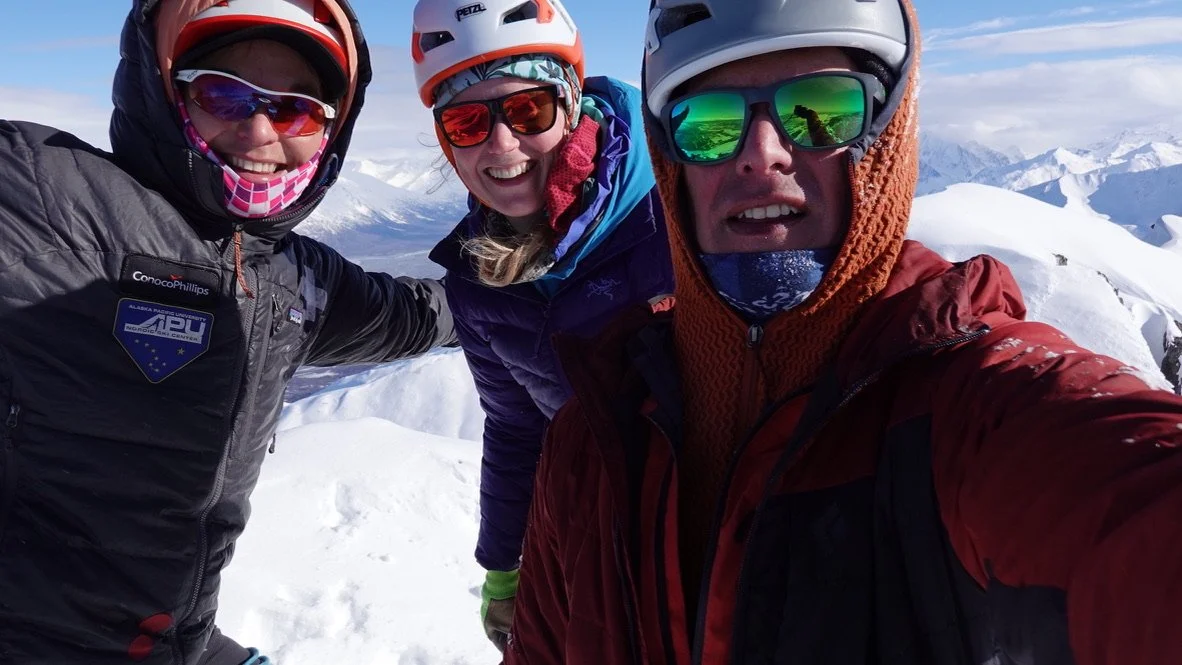 Paige and Kate climbing together up the last steep roped section to the ridge.