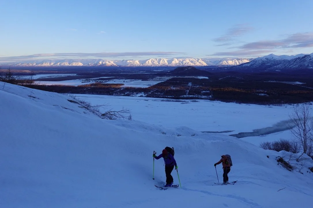 As we pushed the track higher up we noticed a couple more dark shapes popping out of the trees and steadily gaining ground. At the bottom of the steeper rock the skier caught up. We exchanged pleasantries and they headed on up in front of us, breaking trail for the second half of the face. Our legs liked the break.
